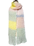 柔らかい上質なKIDモヘアで仕上げた手編みマフラーです。ざっくりとした編み立てのとても軽いリブ編地仕様。フラジールな印象のパステルカラーのボーダー配色とふわふわのモヘア素材が柔らかく暖かみのある印象に。
